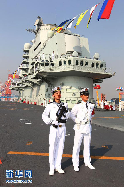 9月25日,“辽宁舰”悬挂满旗,舰员精神抖擞分区列队。 9月25日,我国第一艘航空母舰“辽宁舰”已按计划完成建造和试验试航工作,在中国船舶重工集团公司大连造船厂正式交付海军。经中央军委批准,我国第一艘航空母舰命名为“中国人民解放军海军辽宁舰”,舷号为“16”。“辽宁舰”交接入列后将继续开展相关科研试验和军事训练等工作。新华社记者 查春明 摄 图片来源:新华网