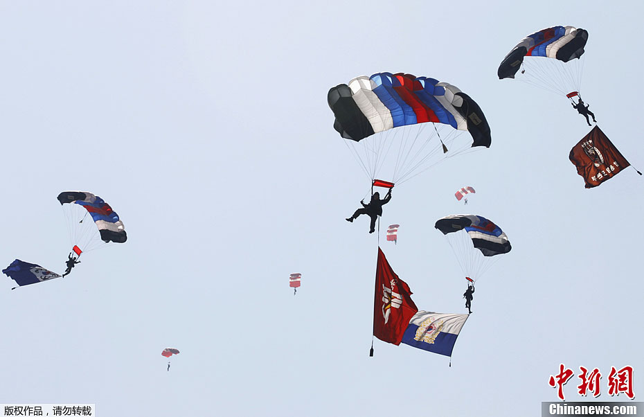 当地时间9月25日,韩国三军总部在首尔以南约140公里的鸡龙举行了建军节仪式预演活动。据悉,韩国建军节仪式将于10月1日举行。图为韩国空降兵在进行跳伞表演。