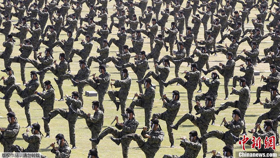 当地时间9月25日,韩国三军总部在首尔以南约140公里的鸡龙举行了建军节仪式预演活动。据悉,韩国建军节仪式将于10月1日举行。图为韩国特种兵在进行表演。