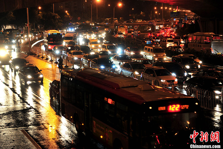 9月25日晚,即将进入“史上最长黄金周”的北京在9月的最后一周迎来了全年的“最堵周”。当日中午至傍晚,北京大部地区出现降雨,局地雨量较大,能见度较低,加上节前交通流量增大,晚高峰时段全市路网交通拥堵指数已经达到8.7,处于严重拥堵状态。图为左安门桥双方向出现拥堵。中新网记者 金硕 摄