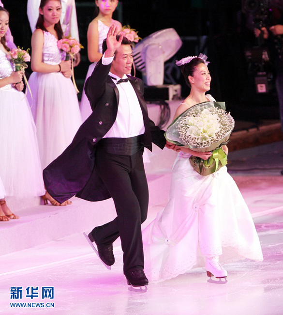 2010年9月4日,温哥华冬奥会冠军申雪和赵宏博的婚礼在首都体育馆举行。与其他体育大腕的婚礼相比,申雪赵洪博的婚礼,主打国际牌,普鲁申科、亚古丁、兰比尔、浅田真央等人特地前来祝贺并在冰场上献技表演。婚礼最让人难忘的是赵宏博单膝跪在冰面上向申雪求婚的感人一幕。 图片来源:新华网