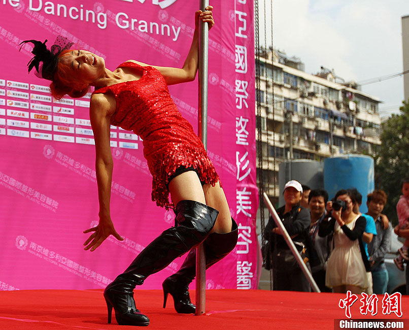 9月26日,60岁的孙凤琴在舞台上跳起钢管舞,引来众多市民的围观。当天,因学习钢管舞被媒体报道后走红、在网络上被称为“钢管舞奶奶”的孙凤琴来到南京某整形美容医院,进行抗衰老年轻化整形后现场表演起钢管舞,优雅、高难度的钢管舞姿博取了全场观众惊羡的目光,引得一片叫好声。“钢管舞奶奶”孙凤琴跳的很有专业范儿。泱波 摄