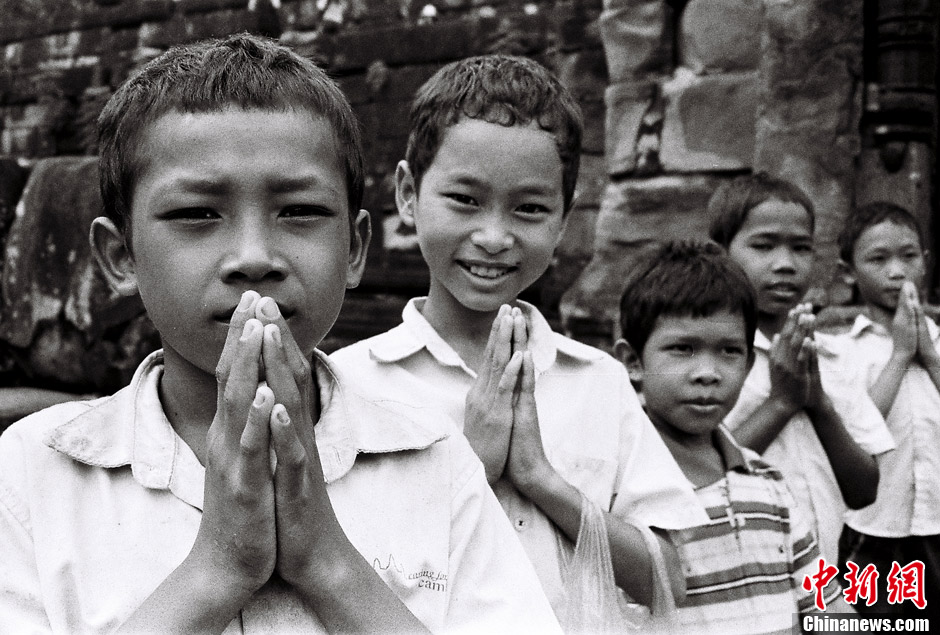 2012年9月,柬埔寨吴哥。在这里总能见到一些光脚奔跑的孩子,稍大些的带着小的。生活的窘迫和教育条件的落后让这里的一些孩子不得不放弃上学,就在吴哥景区叫卖小商品来补贴家用。他们穿梭在吴哥大小景点的残垣断壁间,等待着游人的糖果。中新网记者 林沛青 摄