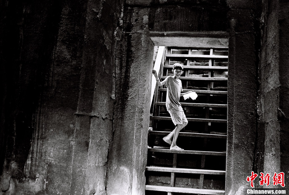 2012年9月,柬埔寨吴哥。在这里总能见到一些光脚奔跑的孩子,稍大些的带着小的。生活的窘迫和教育条件的落后让这里的一些孩子不得不放弃上学,就在吴哥景区叫卖小商品来补贴家用。他们穿梭在吴哥大小景点的残垣断壁间,等待着游人的糖果。中新网记者 林沛青 摄