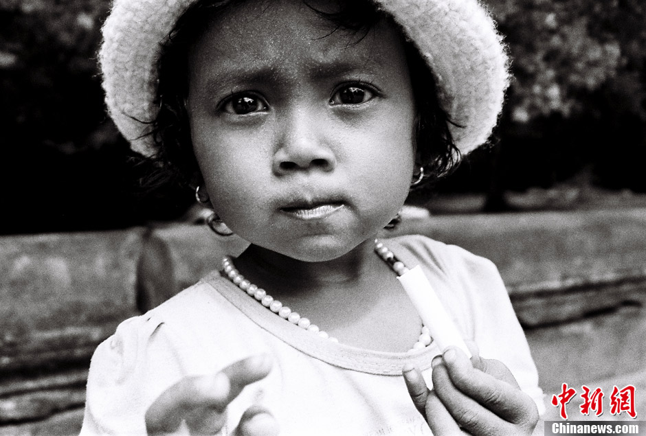 2012年9月,柬埔寨吴哥。在这里总能见到一些光脚奔跑的孩子,稍大些的带着小的。生活的窘迫和教育条件的落后让这里的一些孩子不得不放弃上学,就在吴哥景区叫卖小商品来补贴家用。他们穿梭在吴哥大小景点的残垣断壁间,等待着游人的糖果。中新网记者 林沛青 摄