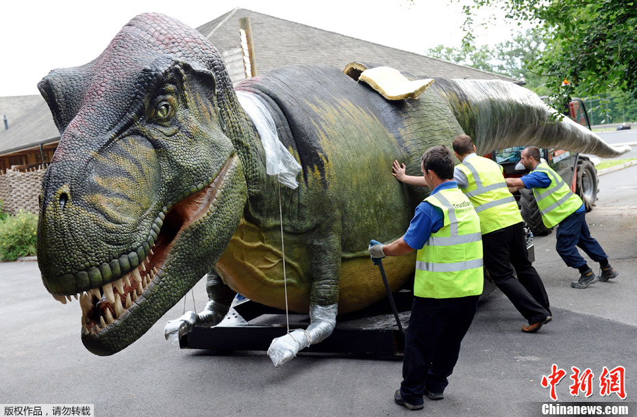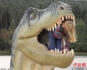 德国恐龙展 好奇女孩钻进恐龙“血盆大口”
