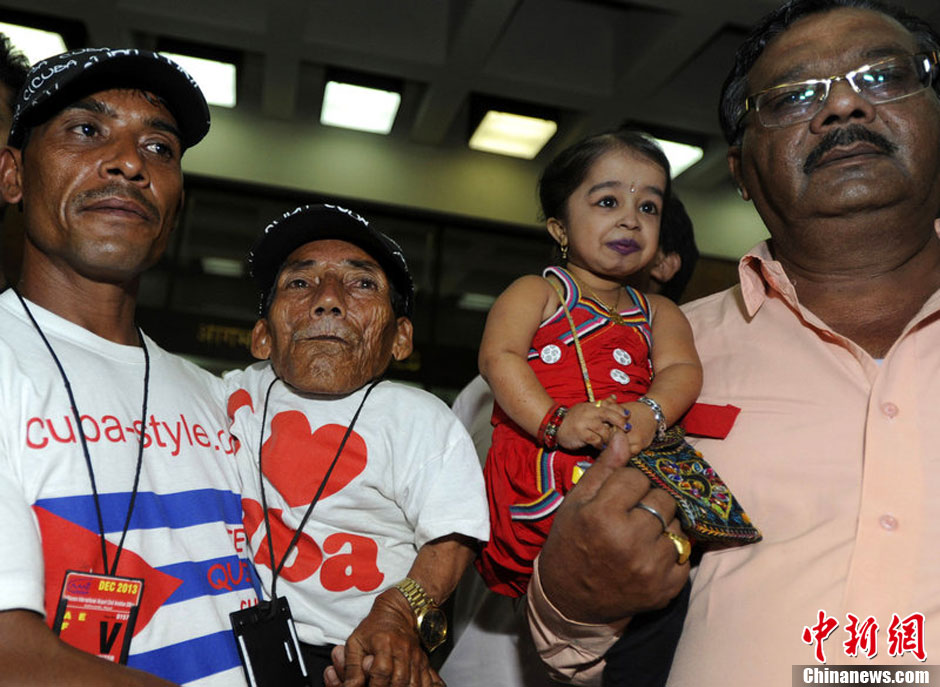 当地时间9月27日,尼泊尔加德满都,世界上最矮的男人72岁的Chandra Bahadur Dangi在加德满都机场欢迎世界上最矮的女人,18岁的印度女孩Jyoti Amge。Jyoti Amge当日抵达加德满都,进行为期三天的访问。图片来源:东方IC 版权作品 请勿转载