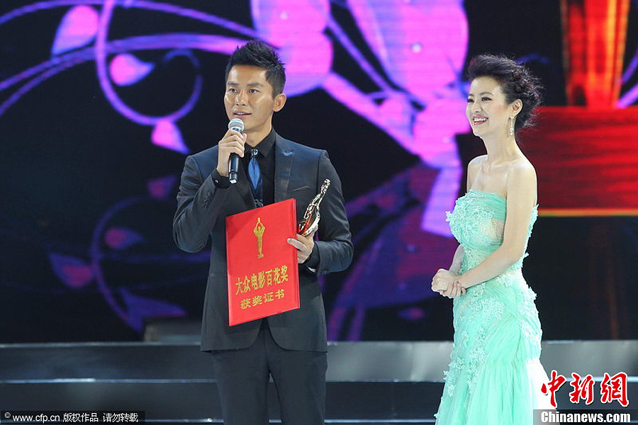 9月29日,第21届金鸡百花电影颁奖典礼在浙江绍兴举行,文章和白百合凭借《失恋33天》分获影帝和影后,冯小刚则因为《唐山大地震》获得最佳导演。图为李晨代替冯小刚领取最佳导演奖。图片来源:CFP视觉中国