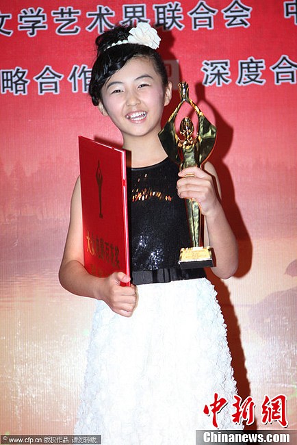 9月29日,第21届金鸡百花电影颁奖典礼在浙江绍兴举行,文章和白百合凭借《失恋33天》分获影帝和影后,冯小刚则因为《唐山大地震》获得最佳导演。图为最佳新人张子枫举奖杯。图片来源:CFP视觉中国