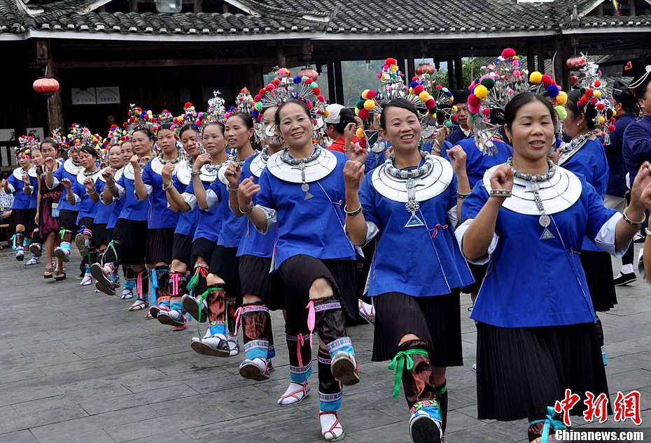 10月3日,中国国庆黄金周进入第四天,游客源源不断进入广西三江侗族自治县景区,体验多耶、百家宴、芦笙舞、“月也”等侗家民俗风情原生态系列活动。图为10月3日,广西三江侗族自治县林溪乡冠洞村冠小屯的村民给游客表演民族舞蹈。吴练勋 摄