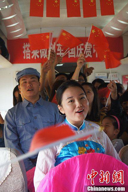 10月3日,南昌铁路局“体验红色之旅”活动在Z133/4次北京西至南昌“井冈山号”列车展开。活动中,列车上的“红色文化长廊”及具有红军特色的自助餐是“井冈山号”列车准备的两道“主菜”,在车厢内可以观看“红色文化”展板,还可以听列车员讲解这些展板上的红色故事、唱红歌,体验一番列车上的“红色之旅”。图为列车工作人员在车厢内进行舞蹈演出,旅客们挥舞着手中的国旗。蔡栩 摄