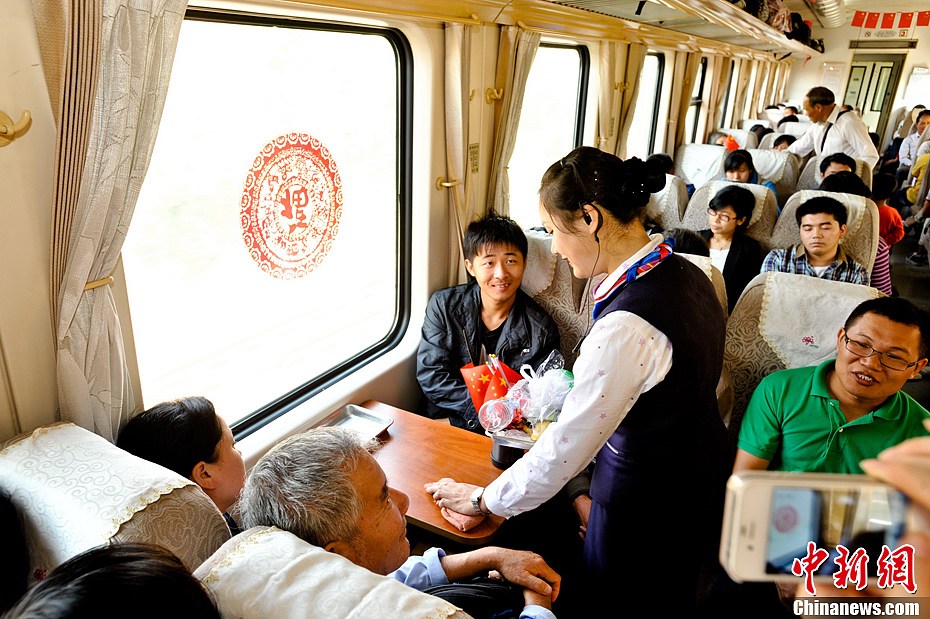 10月3日,南昌铁路局“体验红色之旅”活动在Z133/4次北京西至南昌“井冈山号”列车展开。活动中,列车上的“红色文化长廊”及具有红军特色的自助餐是“井冈山号”列车准备的两道“主菜”,在车厢内可以观看“红色文化”展板,还可以听列车员讲解这些展板上的红色故事、唱红歌,体验一番列车上的“红色之旅”。图为北京开往南昌的Z133次“井冈山号”列车乘务人员正在为旅客服务。张学东 摄