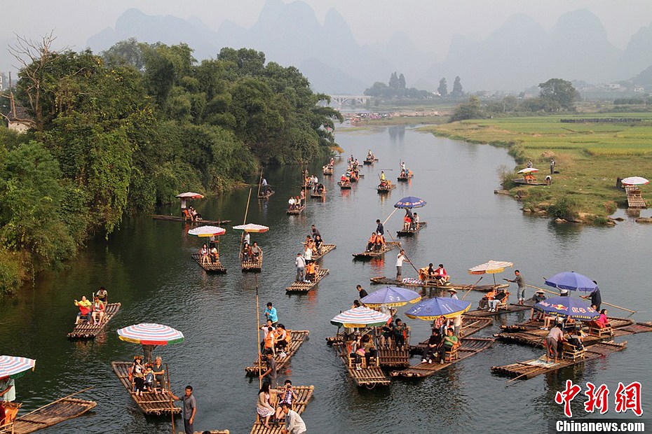 10月3日,中外游客在广西阳朔县漂流遇龙河。中秋、国庆“双节”长假,旅游胜地阳朔县自驾车和自助游客与往年相比明显增多,县城旅游异常火爆现“人山车海”。随着休闲农业与乡村旅游的不断兴起,阳朔县的旅游重镇——高田、阳朔、白沙、福利、兴坪、杨堤的旅游也异常红火。途经白沙、高田和阳朔镇的遇龙河竹筏漂流倍受中外游客喜爱。中新社发 贺振敏 摄