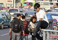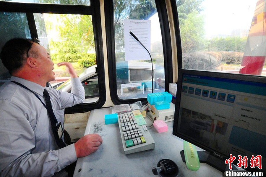 10月4日12时起,全国各高速公路出入口对符合免费政策的七座及以下小型客车不再采取发卡措施,直接抬杆放行。图为4日,浙江杭州绕城高速收费站工作人员对符合免费政策的汽车直接抬杆,挥手示意直接通过。周炜 摄 图片来源:东方IC 版权作品 请勿转载