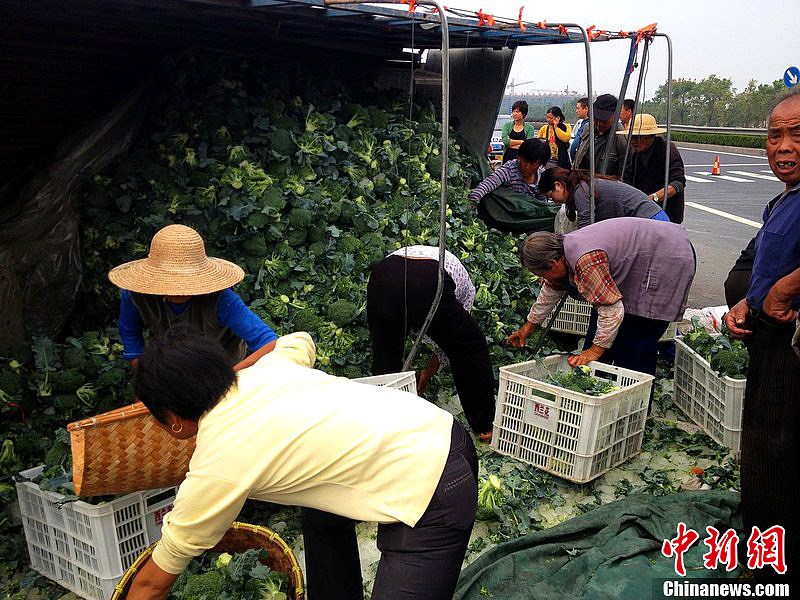 车辆侧翻数吨花菜洒落 20多村民义务帮忙