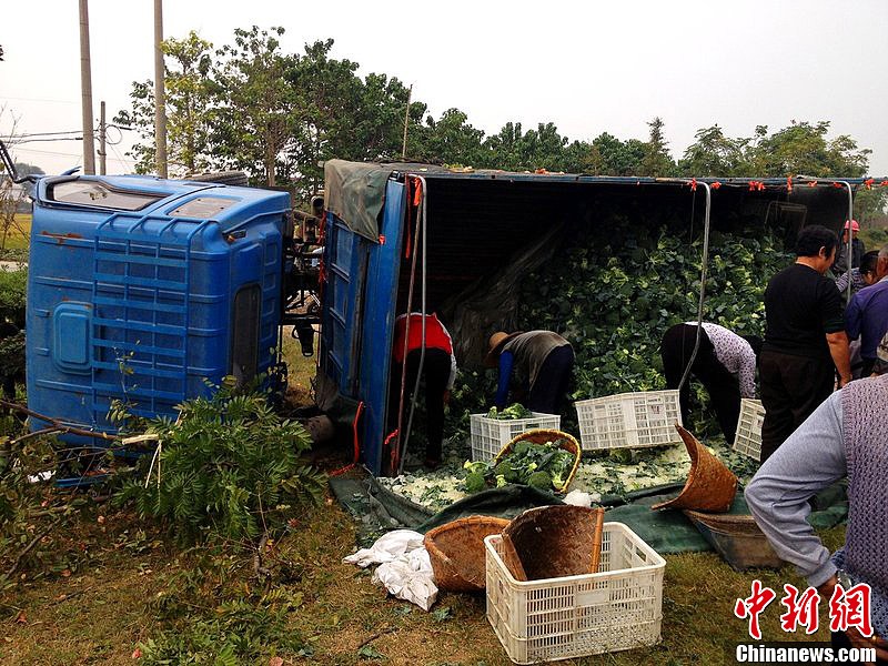 车辆侧翻数吨花菜洒落 20多村民义务帮忙