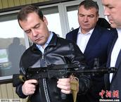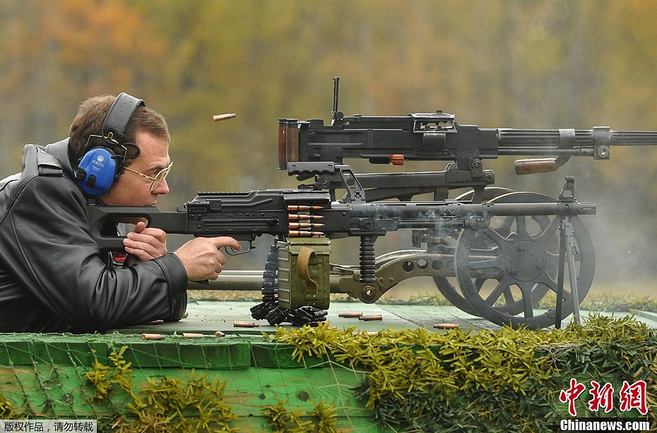 当地时间10月3日,俄罗斯总理梅德韦杰夫视察了位于莫斯科郊外的克利莫夫斯克(Klimovsk)兵工厂,并在试枪场试射了机枪。