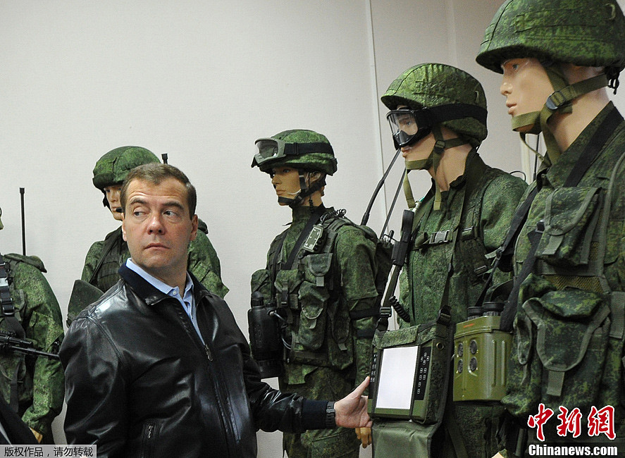 当地时间10月3日,俄罗斯总理梅德韦杰夫视察了位于莫斯科郊外的克利莫夫斯克(Klimovsk)兵工厂,并在试枪场试射了机枪。图为梅德韦杰夫正在视察兵工厂。