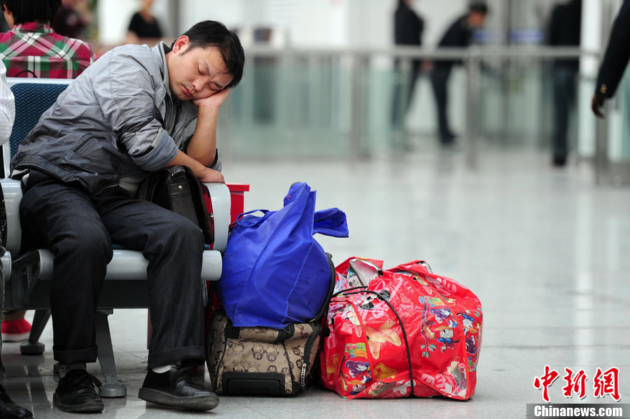 10月7日,中秋、国庆“双节”接近尾声,外出旅游、探亲访友的旅客纷纷踏上归程。在辽宁省沈阳市沈阳北站候车厅,一位劳累的旅客在小憩。中新社发 于海洋 摄