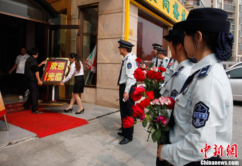 2012年10月6日,武汉,美女执法队员手拿鲜花,在执法中送给配合执法的商户,并送上节日的祝福。继“眼神执法”、“举牌执法”和“围观执法”后,武汉城管再现柔性管理——“献花执法”:城管队员在劝阻占道商户时,如果商家配合地将占道物品搬进店里,城管会给其献上一束玫瑰花。龙飞 摄 图片来源:CFP视觉中国