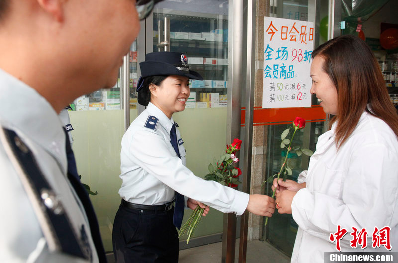 2012年10月6日,武汉,美女执法队员手拿鲜花,在执法中送给配合执法的商户,并送上节日的祝福。龙飞 摄 图片来源:CFP视觉中国