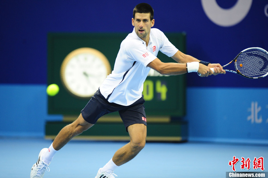 10月7日,塞尔维亚名将德约科维奇在当日进行的2012中国网球公开赛男子单打决赛中击败法国名将特松加,第三次加冕中网男单冠军。图为德约科维奇反手救球。中新社发 崔楠 摄