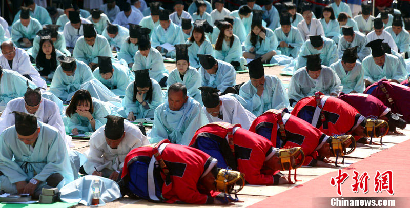 当地时间2012年10月7日,韩国汉阳城,考生参加在云岘宫举办的“科举考试”,席地而坐进行限时作文。该活动是为汉阳城申请列入联合国教科文组织世界文化遗产做宣传。图片来源:东方IC 版权作品 请勿转载