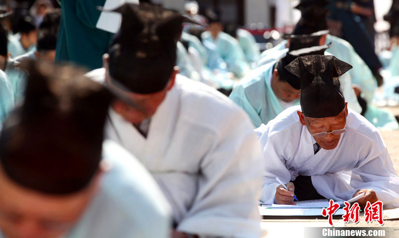 当地时间2012年10月7日,韩国汉阳城,考生参加在云岘宫举办的“科举考试”,席地而坐进行限时作文。该活动是为汉阳城申请列入联合国教科文组织世界文化遗产做宣传。图片来源:东方IC 版权作品 请勿转载
