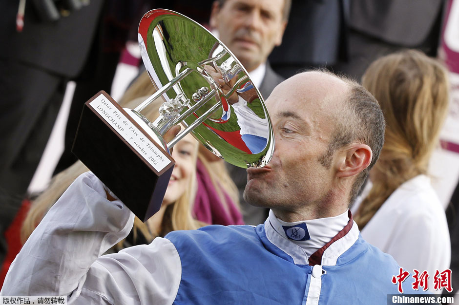 当地时间10月7日,法国巴黎,第91届卡塔尔凯旋门赛马大赛举行。图为大赛优胜者手举奖杯。