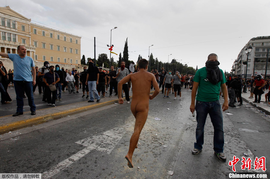 10月9日,德国总理默克尔前往雅典,对希腊进行欧债危机以来的首次访问。但这次的“友好之行”却遭到了当地民众的强烈抵制。图为一名男子裸奔抗议。