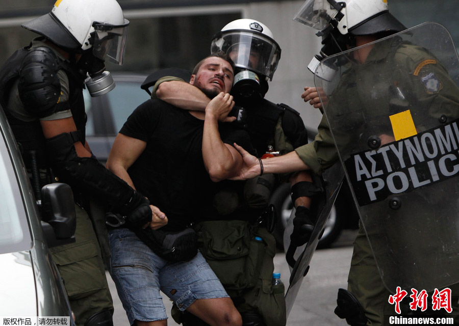 10月9日,德国总理默克尔前往雅典,对希腊进行欧债危机以来的首次访问。但这次的“友好之行”却遭到了当地民众的强烈抵制。图为一名参与抗议的男子被警方拒捕。