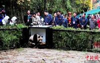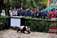 10月11日上午11时20分,2岁零2个月的大熊猫“淘淘”在接受26个月的培训后,放归到四川雅安市石棉县栗子坪自然保护区,这标志着“淘淘”正式回归大自然,也是中国第二次对大熊猫进行野放。图为大熊猫“淘淘”即将走出笼门,开始了回归大自然的生活。中新社发 安源 摄