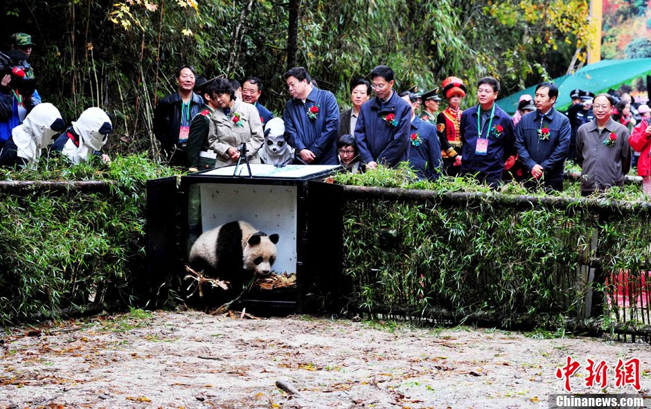10月11日上午11时20分,2岁零2个月的大熊猫“淘淘”在接受26个月的培训后,放归到四川雅安市石棉县栗子坪自然保护区,这标志着“淘淘”正式回归大自然,也是中国第二次对大熊猫进行野放。图为大熊猫“淘淘”进入野外,开始了回归大自然的生活。中新社发 安源 摄