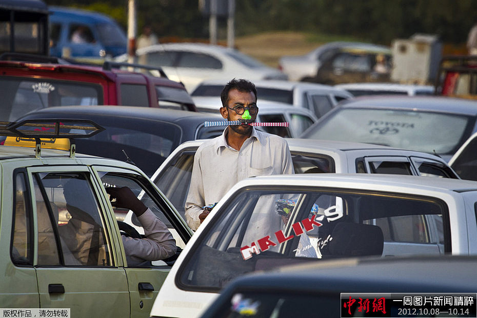 周一(8日),巴基斯坦伊斯兰堡一条路上,一名兜售玩具的小贩吹着一个形似胡子的哨子吸引顾客。
