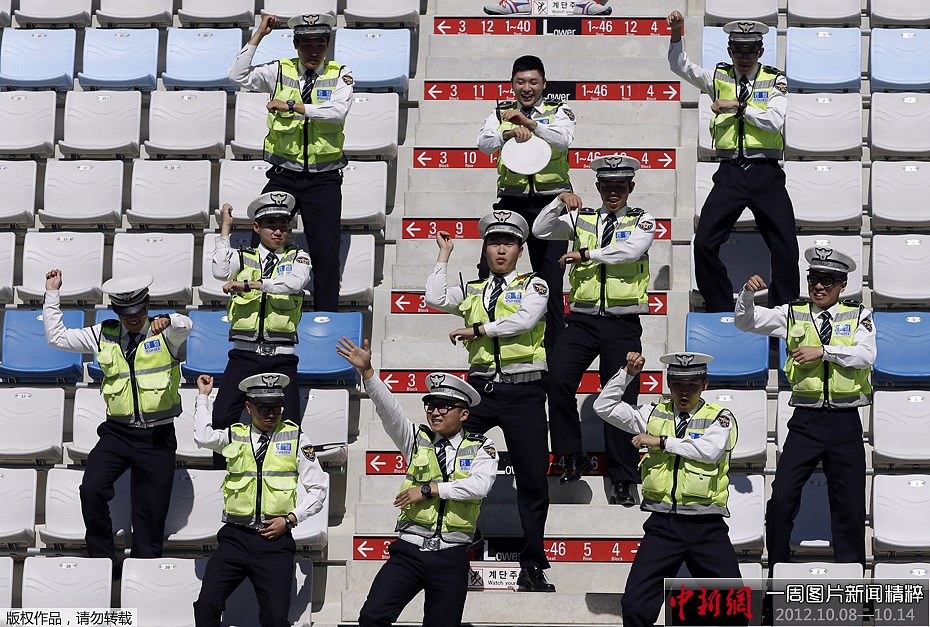 周四(11日),韩国灵岩,F1韩国站前夕,看台上负责安保的韩国警察跳起了“江南STYLE”骑马舞。