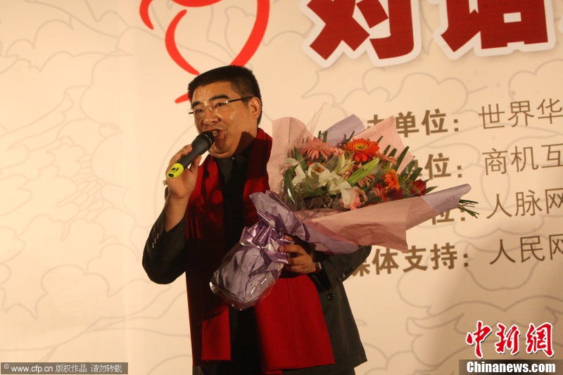 10月14日,“中国首善”陈光标对话烟台企业家资源整合高峰会在山东省烟台市经济技术开发区喜来登大酒店进行,陈光标通过讲述他的爱国情怀和全新的商业理念,讲述自己的人生经历和感悟,给企业家和观众以启迪,同时在讲述中穿插了他的魔术和演唱等拿手好戏。图为陈光标在演唱他的爱国歌曲。图片来源:CFP视觉中国