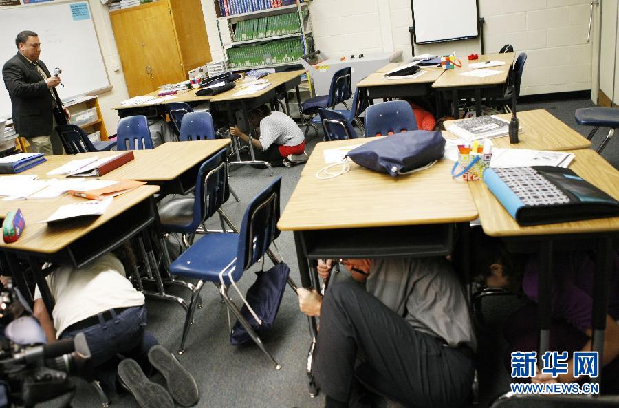 10月18日,在美国弗吉尼亚州雷斯顿,兰斯顿·休斯中学的学生们在教室中进行地震发生时的躲避练习。当日,兰斯顿·休斯中学组织学生们参加了由美国地质勘探局和联邦紧急措施署共同举办的地震演习,通过对地震成因的解释以及遇到地震时的应急措施演练等活动,旨在让人们更深入地了解地震中可能存在的危险和应采取的正确逃生技巧。新华社记者方喆摄 图片来源:新华网