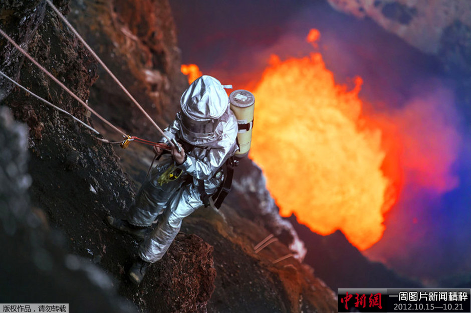 新西兰人杰夫·麦凯里热爱冒险,他与友人一同前往距离澳大利亚西北海岸2400公里的安布里(Ambryn)岛,成功进入马鲁姆(Marum)活火山口。他身穿高温服,沿绳索从火山口下降400米进入山体内部,在距离滚烫岩浆不到30米的平台上坐下,成为世界上第一个在火山口与岩浆如此“近距离接触”的人。杰夫回忆当时的情景时说,“我仿佛是在太阳表面,虽然身穿高温服,但仍感觉置身于烤箱中。”据悉,马鲁姆火山是全球1500座活火山之一,它位于安布里岛上。该岛又被称作“黑岛”,因为活火山很活跃,经常会喷出火山灰从而导致天空呈现灰黑色。图片来源:东方IC 版权作品 请勿转载