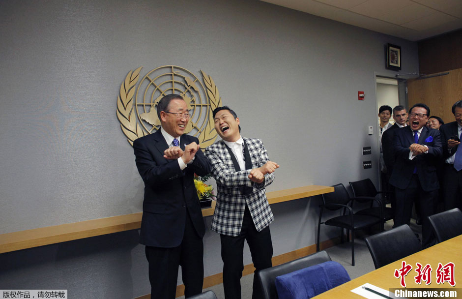 当地时间10月23日,美国纽约,联合国秘书长潘基文在联合国总部会见大热神曲《江南style》的演唱者、韩国歌手“鸟叔”PSY,并一起大跳“骑马舞”,现场搞笑不断。