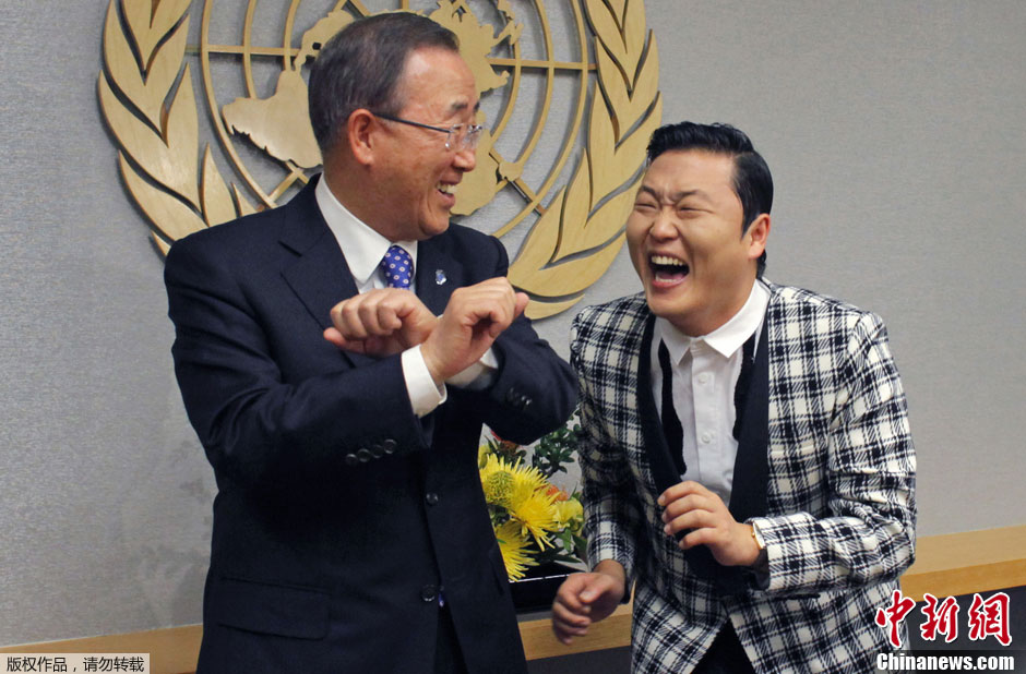 当地时间10月23日,美国纽约,联合国秘书长潘基文在联合国总部会见大热神曲《江南style》的演唱者、韩国歌手“鸟叔”PSY,并一起大跳“骑马舞”,现场搞笑不断。