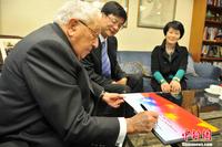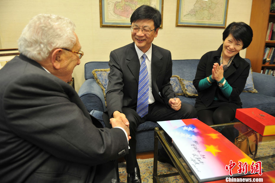 当地时间10月25日,中新社社长刘北宪(中)在美国分社社长王晓晖(右)陪同下,于纽约拜会美国前国务卿、诺贝尔和平奖获得者基辛格。中新社发 贾国荣 摄