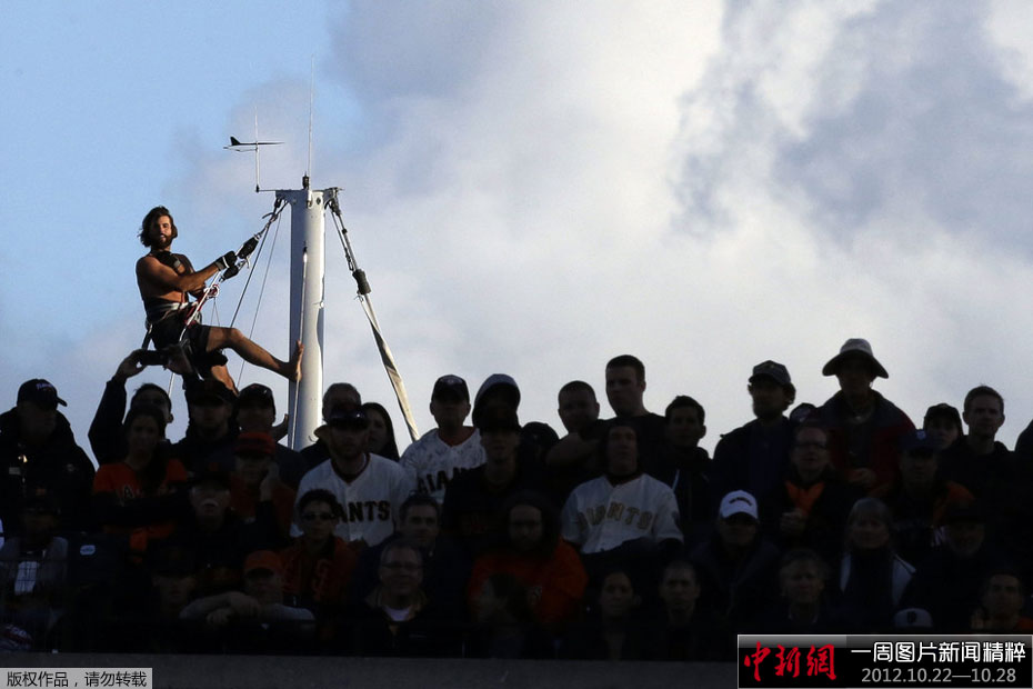 周一,美国旧金山,在国家联盟冠军赛(National League Championship)旧金山巨人队对阵圣路易红雀队第7场第二局的比赛中,一名棒球迷爬到船桅高处观看比赛。最后,巨人队以9-0的比分赢得了比赛。