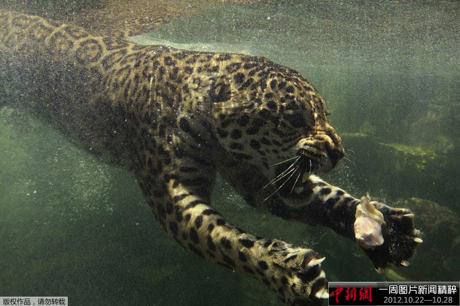 印尼茂物(Bogor)的印尼野生动物园(Taman Safari Indonesia)内,周二喂食之时,一只美洲虎游向掉入水中的食物。
