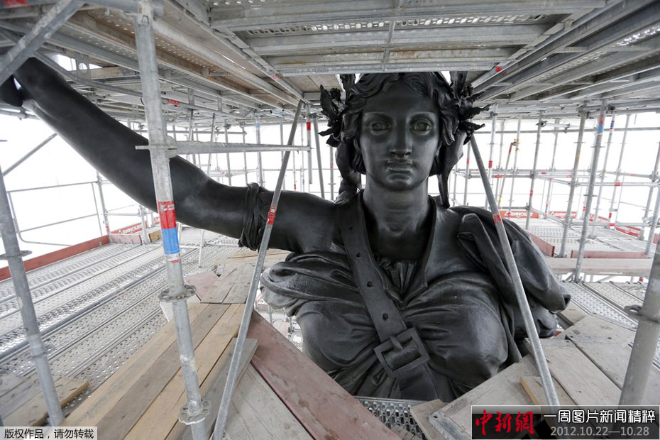 周三,巴黎的共和国广场(Place de la Republique),一座雕塑旁支起了脚手架。该广场正在进行翻修,翻修工程将持续至2013年春。