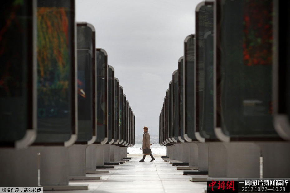 葡萄牙首都里斯本的科梅尔西奥(Comercio)广场举办了一个街头展。图为周四,一名妇女看着镶在框中展出的照片和画作。