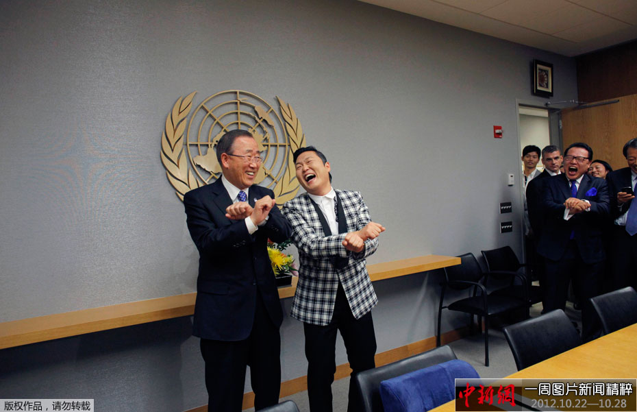 当地时间10月23日,美国纽约,联合国秘书长潘基文在联合国总部会见大热神曲《江南style》的演唱者、韩国歌手“鸟叔”PSY,并一起大跳“骑马舞”,现场搞笑不断。