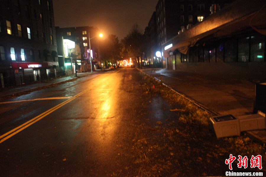 飓风“桑迪”美东时间29日晚8时许(北京时间30日上午8时)在美国新泽西州大西洋城附近登陆。目前“桑迪”仍在对纽约等地构成严重威胁。图为“桑迪”登陆后,纽约狂风呼啸,街头空无一人。纽约当局要求普通民众呆在家中,不要出门。目前飓风已经造成美东地区数人死亡。中新社发 李洋 摄