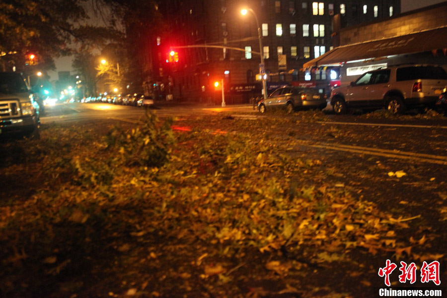 飓风“桑迪”美东时间29日晚8时许(北京时间30日上午8时)在美国新泽西州大西洋城附近登陆。目前“桑迪”仍在对纽约等地构成严重威胁。图为“桑迪”登陆后,纽约狂风呼啸,街头空无一人,到处残枝败叶。中新社发 李洋 摄