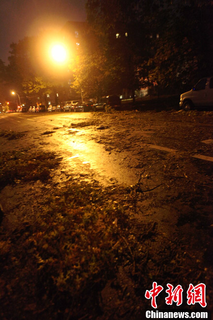 飓风“桑迪”美东时间29日晚8时许(北京时间30日上午8时)在美国新泽西州大西洋城附近登陆。目前“桑迪”仍在对纽约等地构成严重威胁。图为“桑迪”登陆后,纽约狂风呼啸,街头空无一人,到处残枝败叶。中新社发 李洋 摄