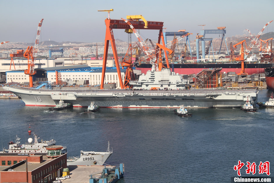 10月30日10时20分,中国航母“辽宁舰”停靠在辽宁省大连港码头,完成了其正式交接入役后的首次出海。图为已驶入大连港码头,停靠在泊位的“辽宁舰”。中新社发 宋太盛 摄